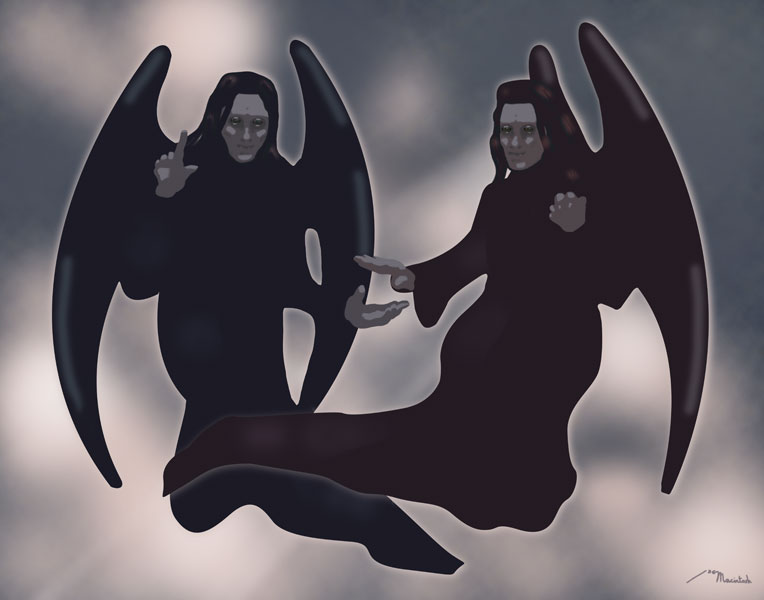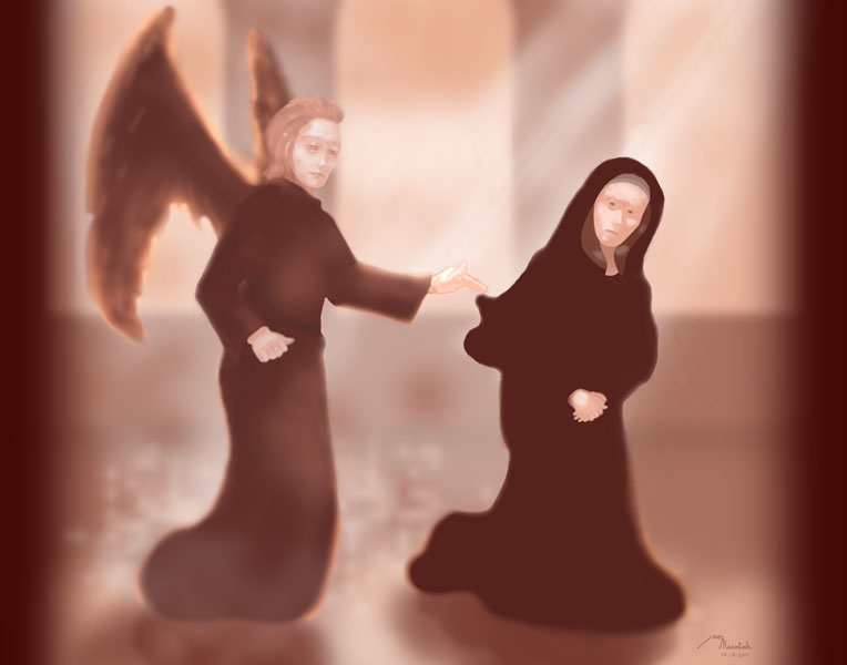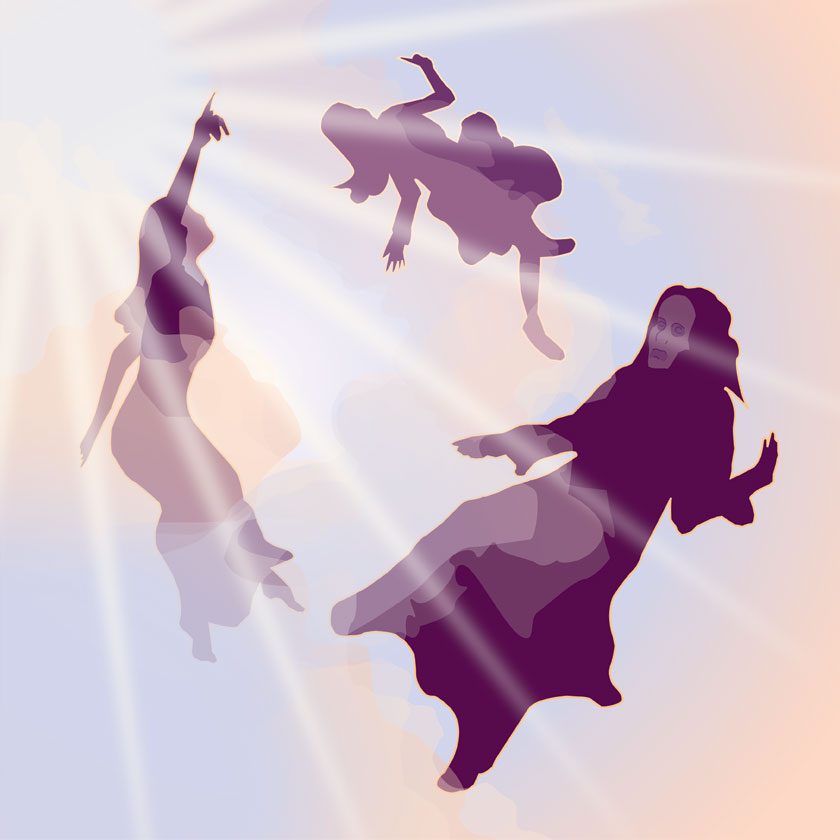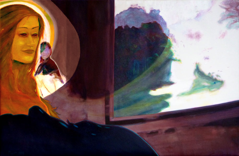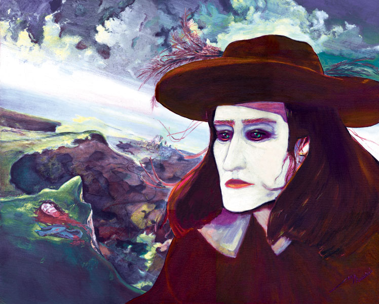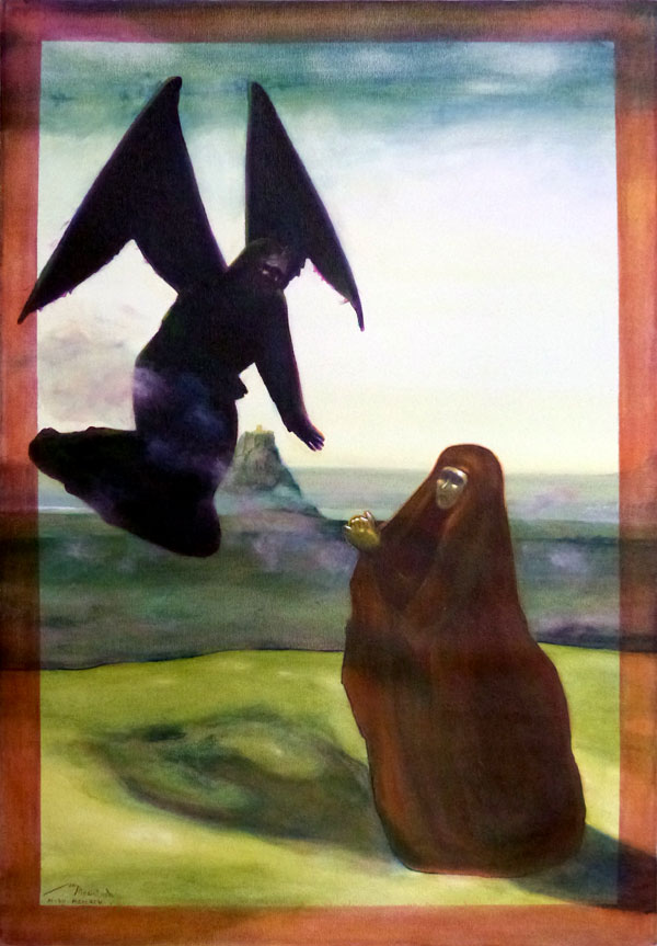 I started the 'Ethereal Muses' group in 1995 with 'Visitation'. Originally an acrylic canvas, my initial intention was to light it from behind creating a translucent effect. As shown, the image is light enough without this, though the effect was interesting. The woman in the foreground prays to be released. The descending angel is an interpretation of those seen in some of the work of Rogier van der Weyden, one of my favourites. 'Apparition' indicates a miraculous appearance or a hallucination. For many such an event is very unusual, still reported by some. 'The Glen' shows a woman progressing alongside the water of a leafy vale. The image of the woodland and stream is a digitally enhanced version of one of my photographs with the woman a superimposed composition, the two blended to form one portrayal. An acrylic canvas, 'Benedicta' depicts a young woman tranquilly gazing at the viewer. She is in front of an archway with a cathedral in the background. Modelled on an English structure the building raises issues of contemplating worship. 'Floating' is an illustration presenting aerial buoyancy, the ability to reach out, rise above and to levitate.