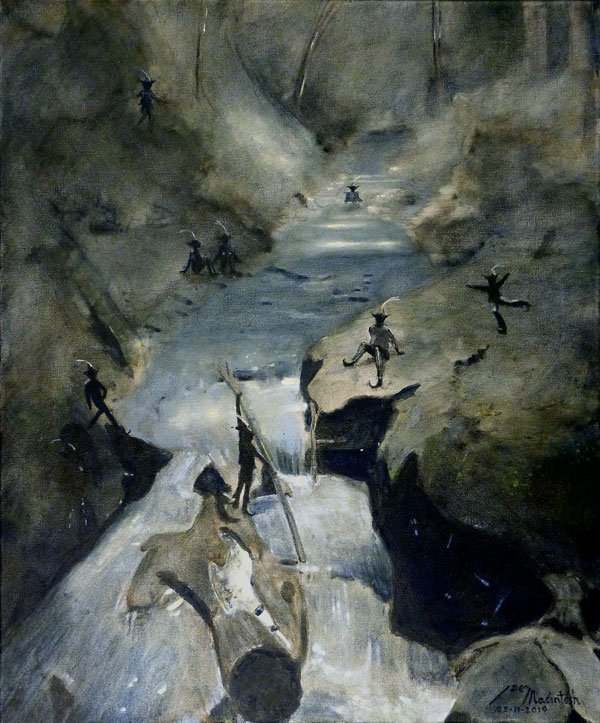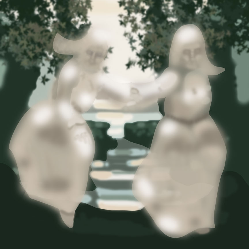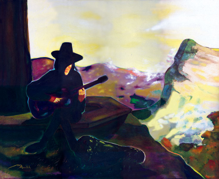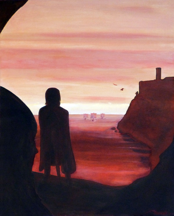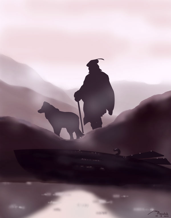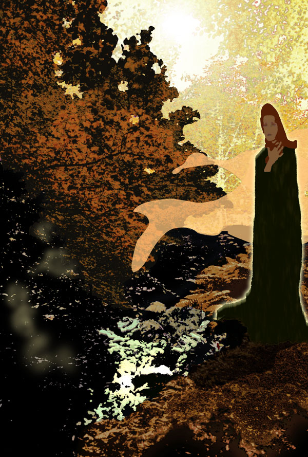 In 'Norse Dusk' a silhouetted leader prepares in the calm before a conflict. 'Angels' portrays a couple of heavenly messengers before they leave on a divine quest. 'Spirits Of The Glen' shows a pair of ghosts wandering through a lakeside glen, hand in hand they obliviously gallivant. 'Night Vision' depicts another hallucination, on this occasion a shadowy figure at night. 'The Annunciation' is an interpretation of the announcement of the Incarnation rendered in a sepia-type palette. 'The Clansman' displays the figure of a Scottish Highlander and his dog before the Highland Clearances. And 'The Little People' shows a congregation of Manx fairies scattered through Glen Helen in the Isle of Man.