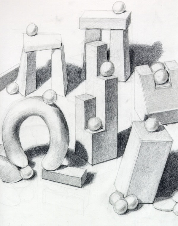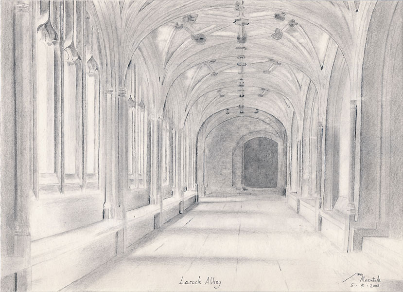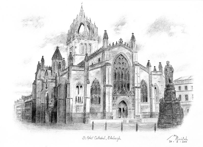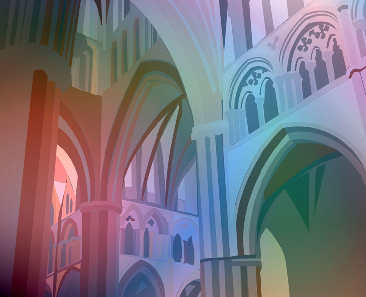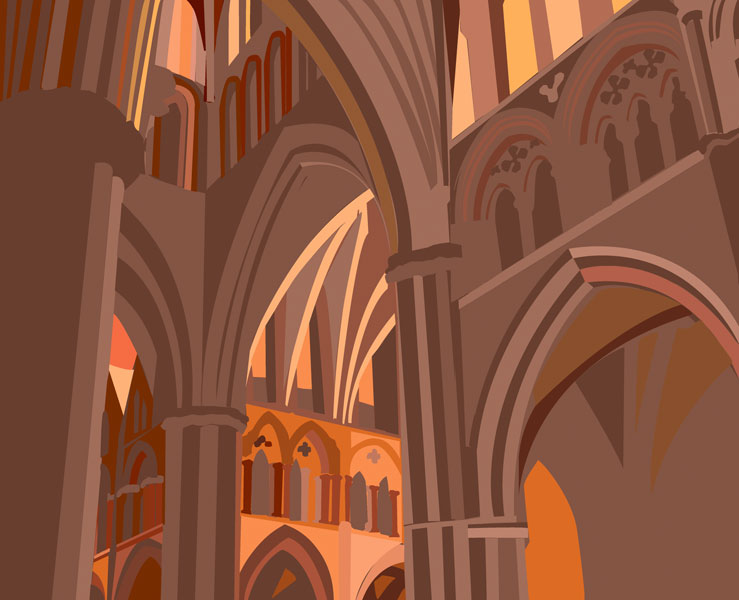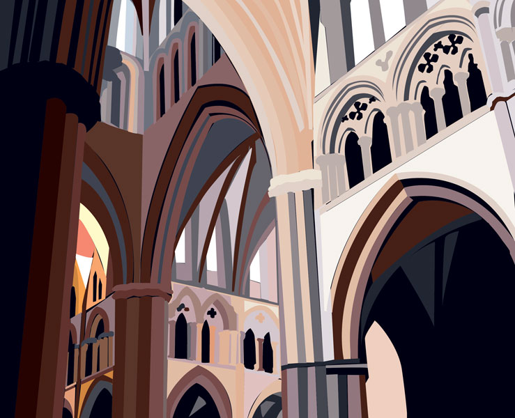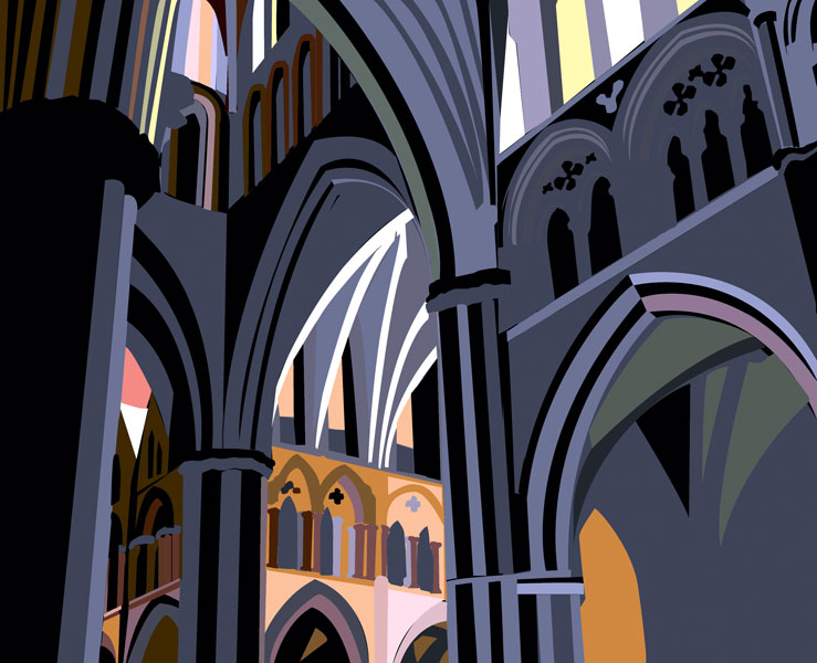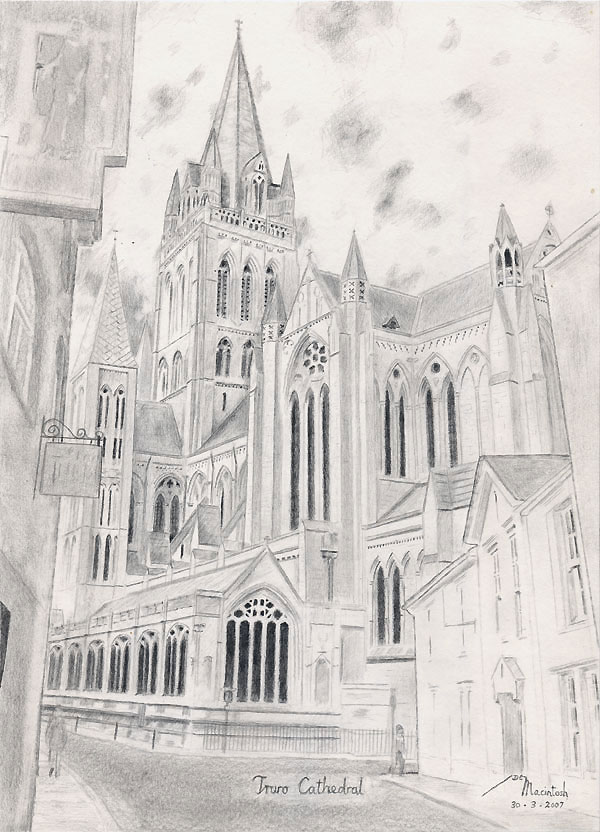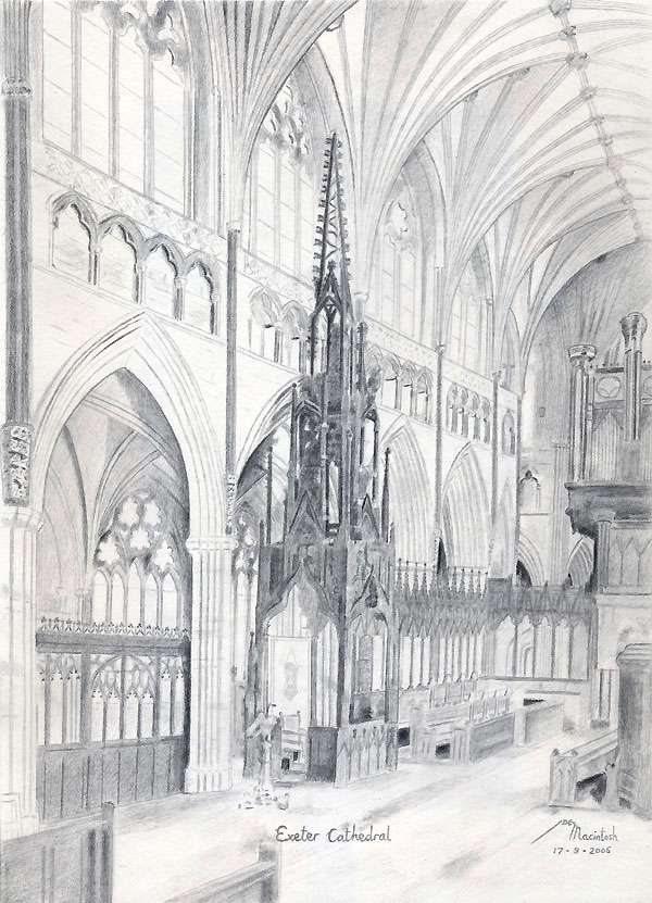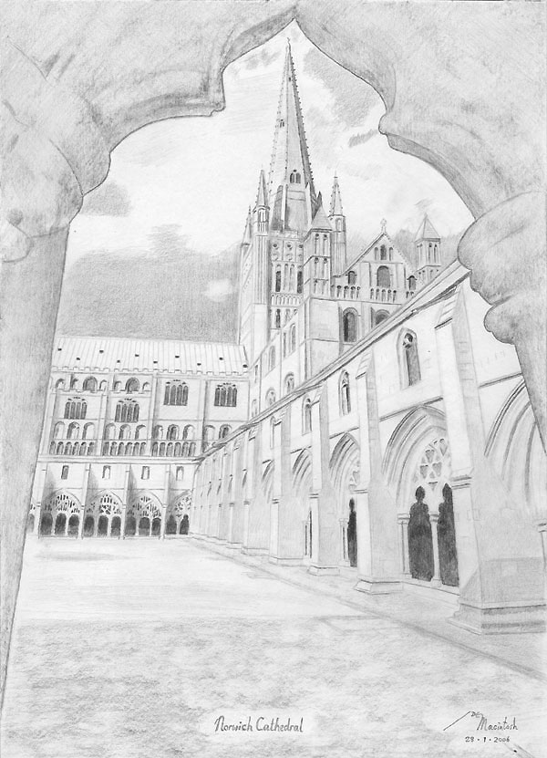 The first three drawings are of English cathedrals - Norwich, Exeter and Truro. These are grouped with Lacock Abbey of Wiltshire and St. Giles' Cathedral of Edinburgh, followed by a series of four computer illustrations of one aspect of Lincoln Cathedral lit in several different ways.