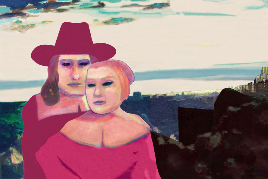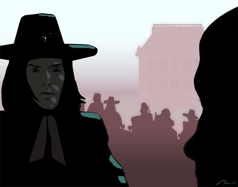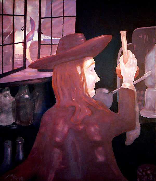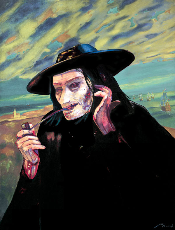 In 'Above The Law' an authoritarian gazes at the viewer. With his hand on a globe he seems determined to accrue worldwide power. 'Dutch In The Medway' presents a smoking rambler, a spectator of a near scrape for England's defence. Suffering from the plague he meets the onlooker with a smile despite being at death's door. He embodies defiance in the face of affliction. 'The Scientist' has his profile showing with a sinister shadow following his moves - perhaps the price to pay for accumulating special knowledge, or is the thought of such surveillance just a suspicion or even a figment? 'Man and Dog 2' conveys passing into the unknown with trepidation. 'Puritans' presents a couple in front of a changing landscape. To the left are unspoiled fields. To the right is a contemporary cityscape, the outcome of settlers' efforts in America. The eyes of the pair are darkened signifying their inability to see the future. 'The Conversation' sees a shadowed man and woman talking in front of a banquet. One can only speculate whether they will jeopardise the evening's proceedings. In 'Man and Dog 3' a roamer plays the guitar, unwinding in the shade while his dog rests at his feet. They are at peace.