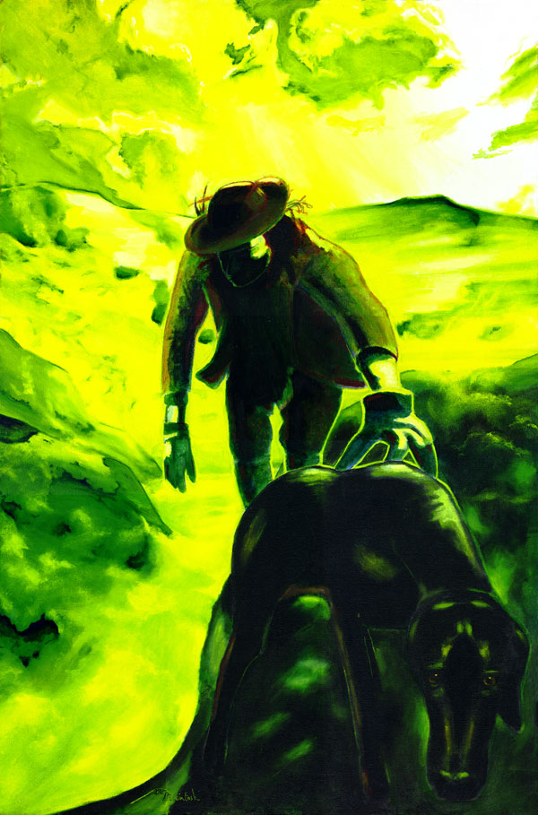 '1649' uses a close-up depiction again. On a hillside in the background lies the severed head of Charles I, King of England, Scotland and Ireland, 1649 being the year he was executed. The painting alludes to the British Isles' monarchy ending at one point, a fact often overlooked. 'Man and Dog 1' depicts wandering through darkness, a metaphor for exposure to adversity.